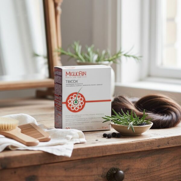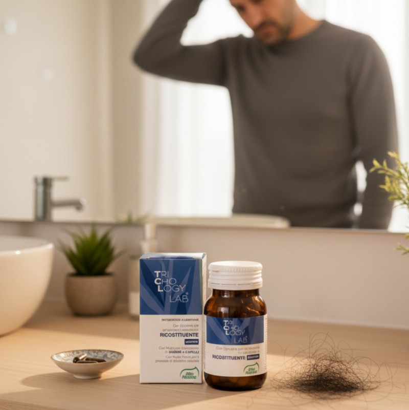 Integratore alimentare ricostituente per capelli uomo Trichology Lab® restituisce al capello forza, robustezza, pettinabilità e volume, coadiuva il fisiologico ciclo di crescita dei capelli, nutrendoli ed aiutandone la ricrescita, agendo su capello e bulbo pilifero. I principi attivi contenuti nella polvere micronizzata di Spirulina favoriscono un’azione di sostegno e ricostituente, mentre il Miglio agisce sul benessere di unghie e capelli. Con aggiunta di estratti secchi di Serenoa, semi di Zucca e polvere micronizzata di Mallo di Noce. Grazie al contenuto di Cheratina idrolizzata, amminoacidi Cistina e Metionina ed Acido Folico contribuisce alla normale funzione del sistema immunitario e sintesi di altri amminoacidi, necessari al fabbisogno del capello.