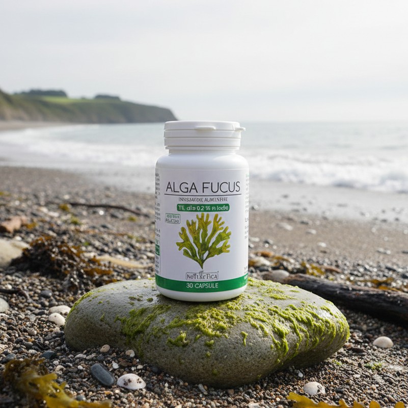 Il Fucus è un’alga bruna il cui tallo è lungo anche fino a un metro, simile ad un nastro e regolarmente ramificato. Tra i componenti principali vi è sicuramente lo iodio, tanto come iodio inorganico quanto come iodio organico, altri sali minerali, oligoelementi, vitamine, alginati e fattori che contribuiscono ad esercitare un’attività depurativa e tonificante metabolica. L’alginato presente nel Fucus gli conferisce una blanda azione lassativa mentre, in virtù della sua azione endocrina, viene impiegato nella terapia della psoriasi, dermopatia nella cui genesi interviene anche uno squilibrio a carico dei lipidi. In fitoterapia, grazie alla sua ricchezza iodio, il Fucus può essere indicato nei soggetti che presentano ipofunzionalità tiroidea stimolando la sintesi degli ormoni tiroidei in modo equilibrato; l’utilizzo dell’alga non è indicato agli ipertiroidei. Una delle tecniche attuate nel trattamento del sovrappeso consiste nello stimolare la funzionalità tiroidea al fine di accelerare i processi di catabolismo; l’Alga Fucus trova impiego all’inizio di una cura dimagrante in quanto, favorendo la funzionalità tiroidea e stimolando il ricambio generale, costituisce lo starter del processo di dimagrimento, che non avviene a carico della massa grassa, ma di quella magra, per l’aumento del catabolismo proteico. L’azione del Fucus, che si inizia ad evidenziare dopo almeno tre settimane, si localizza principalmente nelle sedi maggiormente ricche in tessuto adiposo, quali fianchi, cosce, ecc…