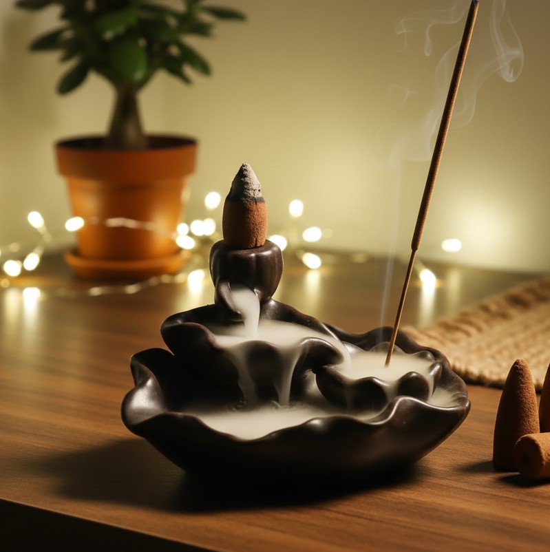 Brucia incenso a fontana con Loto in uno stagno. Il fumo non sale, ma scorre verso il basso, come una cascata. Crea un bellissimo effetto rilassante.