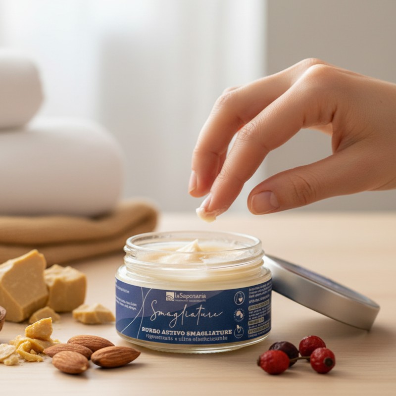 Un burro morbido e vellutato, piacevole da stendere e massaggiare. Con la sua texture ricca e concentrata nutre la pelle in profondità, rendendo la pelle super elastica e compatta, contrastando la formazione di nuove smagliature e levigando e attenuando quelle di vecchia data. Ideale durante pubertà, gravidanza e in caso di variazione di peso. Il burro corpo ideale se desideri contrastare la formazione di nuove smagliature, se vuoi trattare le smagliature rosse di recente formazione o se vuoi levigare e attenuare le smagliature bianche. Con la sua formula ricchissima di attivi è in grado di stimolare il turnover cutaneo, aumentare la produzione di collagene e rendere la pelle elastica e tonica!