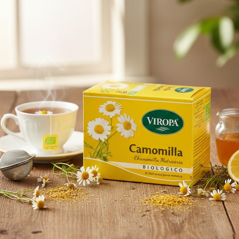 Tisana CAMOMILLA Viropa, Biologica, in Filtri. Si potrebbe pensare che sulla camomilla si è già detto tutto e che, data la sua grande popolarità, molto spesso non è presa in seria considerazione come si meriterebbe. Si è scoperto invece, tempo fa, che questa pianta è in grado di rendere innocui certi batteri. L’infuso della camomilla ha un effetto sedativo e facilità il sonno.