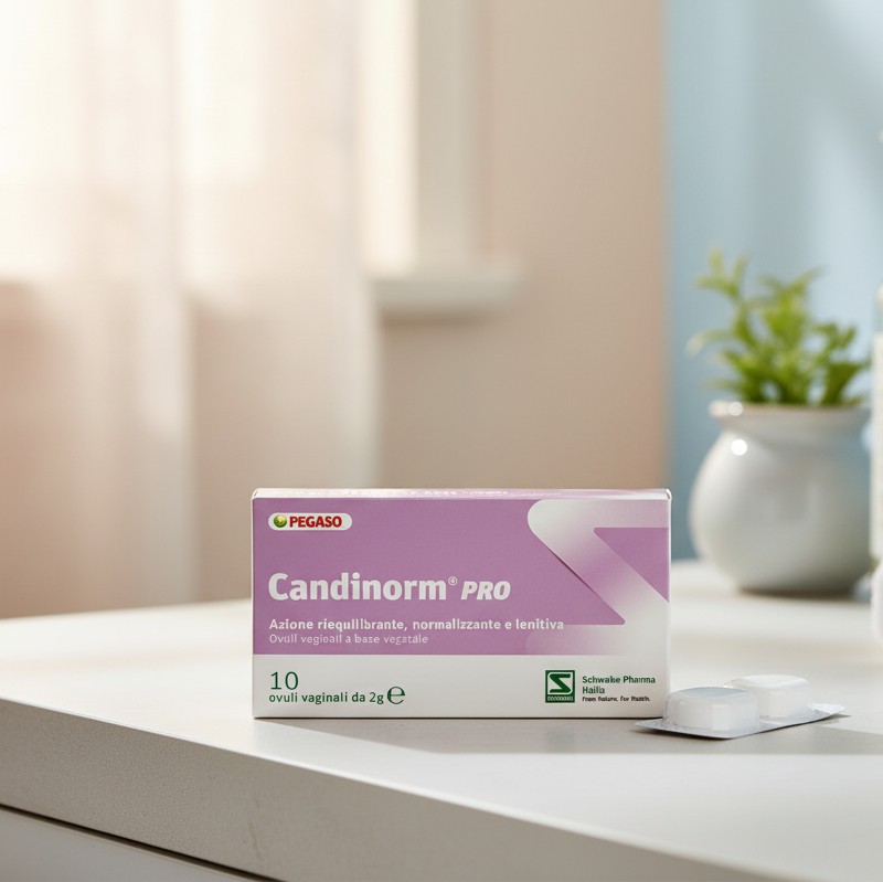 Candinorm PRO Ovuli Vaginali è un dispositivo medico formulato per il ripristino e il mantenimento dell’equilibrio della microflora batterica vaginale e del pH fisiologico. Grazie alla sinergia di ingredienti funzionali naturali, è un coadiuvante efficace in caso di infezioni e infiammazioni dell’apparato genito-urinario, offrendo un’azione riequilibrante, normalizzante e lenitiva contro sintomi come prurito, bruciore e perdite anomale.