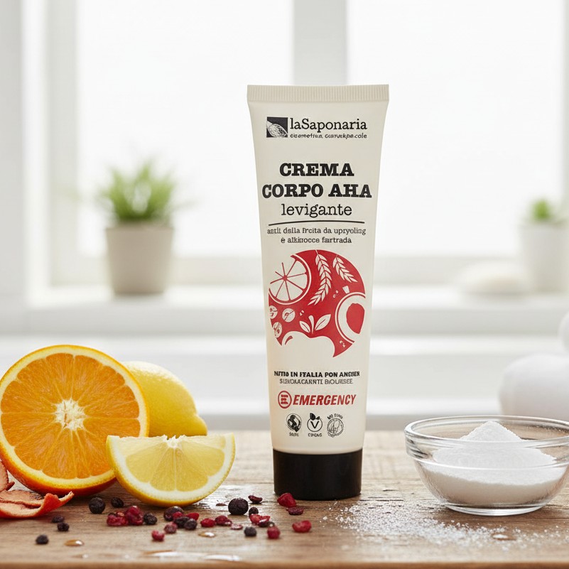 L’olio di noccioli di albicocca insieme alla vitamina E e F nutrono la pelle e la rende elastica e morbida. Gli acidi della frutta derivano da un progetto di upcycling 100% Italiano e svolgono una leggera esfoliazione, per una pelle sempre morbida e rinnovata.