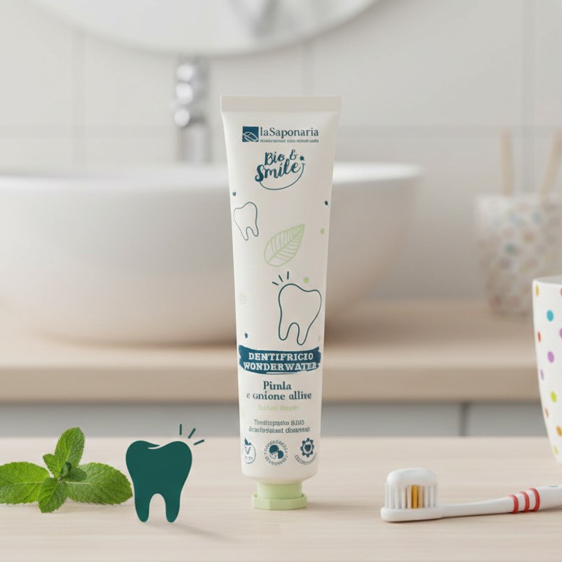 La confezione del dentifricio è in bioplastica, derivata dalla canna da zucchero.