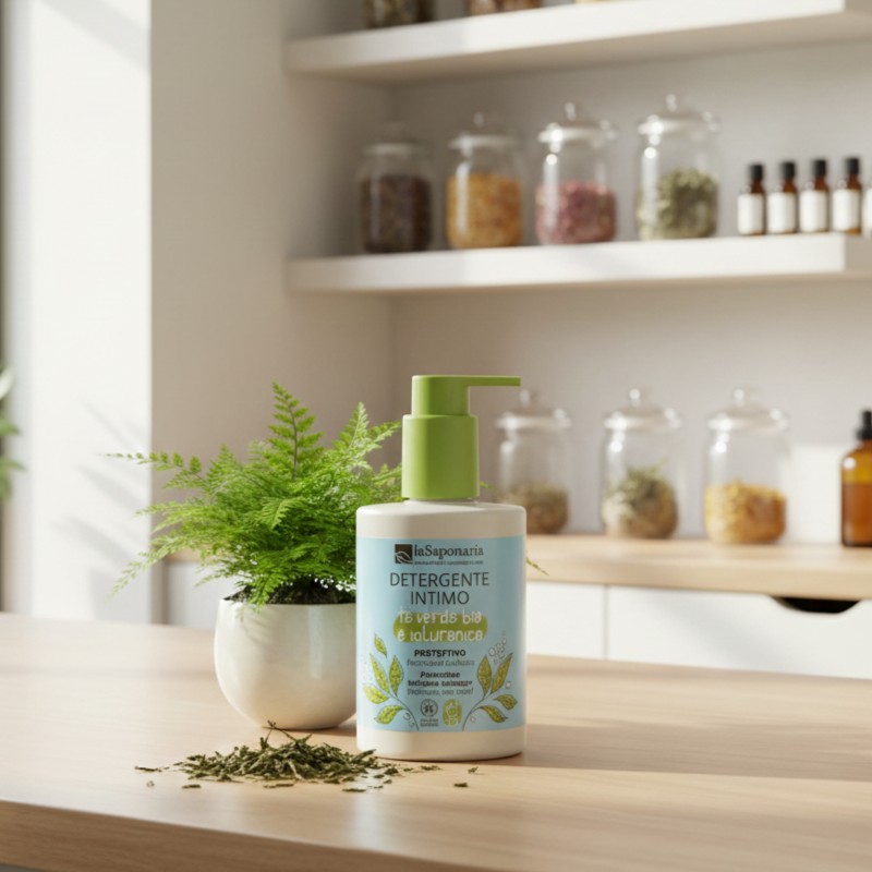 Il Detergente intimo Protettivo Tè verde Bio & Ialuronico ha un pH di 3.5 e una formulazione specifica che aiuta a mantenere freschezza e igiene, offrendo supporto nei momenti di maggiore vulnerabilità e contribuendo a contrastare secchezza e irritazioni.