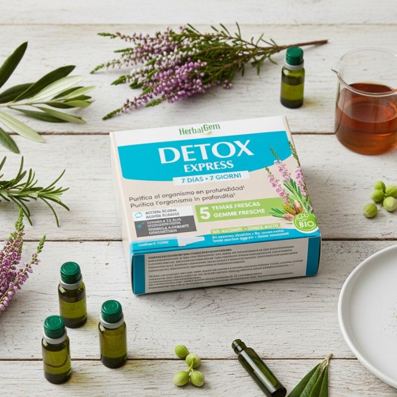 DETOX EXPRESS Aiuta a eliminare naturalmente le tossine in 7 giorni, quando necessario. Azione globale sull’organismo: allevia le tossine e stimola il metabolismo per controbilanciare i periodi di sovralimentazione, accompagnare un digiuno o depurare l’organismo dopo un trattamento o uno sforzo fisico intenso. Ripristina l’equilibrio dell’organismo, il benessere interiore e la piena vitalità. La betulla e il rosmarino agiscono sul fegato e sui reni. Sono antiossidanti e disintossicanti. L’olmo disintossica la pelle, l’ippocastano sostiene il sistema linfatico per migliorare la dinamica generale dell’organismo e l’erica agisce come disacidificante.