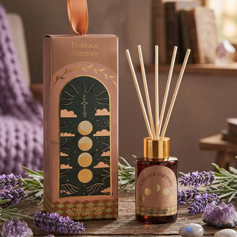 Un diffusore a bastoncini profumato Lunar Lavender. Fragranza che si diffonde lentamente – senza fiamma, poco impegno, presenza costante.