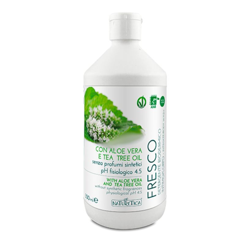 Con Aloe Vera biologico, tensiottivi delicati di derivazione vegetale e olio essenziale naturale di tea tree.