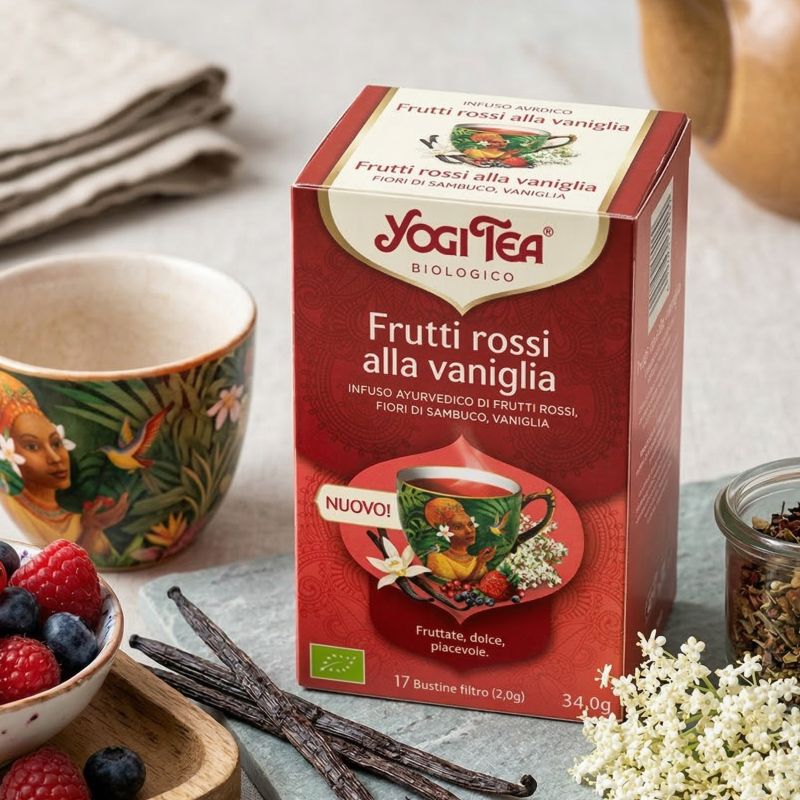 Staccare la spina e godersi il momento. Ci siete solo tu e questo incredibile duetto di frutta e vaniglia. In YOGI TEA® Frutti rossi alla vaniglia, deliziosi frutti di bosco e profumati fiori di sambuco sposano delicati sentori di vaniglia, creando un’esperienza sensoriale straordinaria. Dolce e piacevole, delicata e rassicurante: questa miscela così speciale dona coccole e attenzioni a una persona altrettanto speciale: tu.