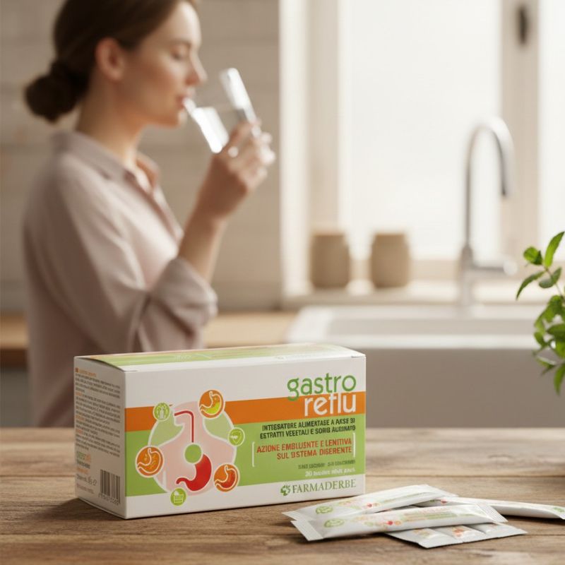 Ingredienti funzionali in 2 bustine: sodio alginato, Altea radice e.s. 200 mg, Camomilla capitula e.s. 200 mg tit.1,2% Apigenina, Mastice di Chios resina e.s. 150 mg tit. 25% acidi masticonici.