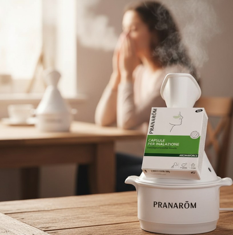Le capsule contengono oli essenziali biologici (Eucalipto, Ravintsara, Menta piperita, Tea Tree e Palmarosa) che aiutano la respirazione.