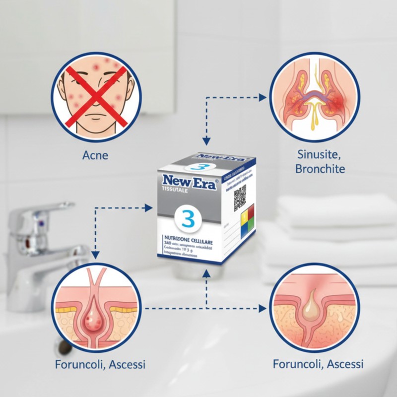 NEW ERA 3 Calcium Sulfuricum è il Sale di Schussler Solfato di calcio indicato in caso di suppurazioni lente a guarire (è necessaria una via di deflusso aperta). Risulta essere un sostegno immunitario nei processi suppurativi della cute e nella depurazione delle mucose mostrandosi indicato in caso di acne, foruncoli, ascessi, cheratite impurità della pelle. E’ uno dei componenti del fegato e della colecisti. Stimola il metabolismo ed è il sale principale per tutte le infezioni purulente, virali, sia croniche che acute e le lesioni suppurative croniche: sinusite, bronchite, fistola anale, sinusite, bronchite. Aiuta lo scioglimento e l’eliminazione di catarri cronici e lenti a guarire ed è quindi utile in caso di ascessi, granulomi, sinusiti croniche, fistole e qualsiasi forma di infiammazione con produzione di catarro.