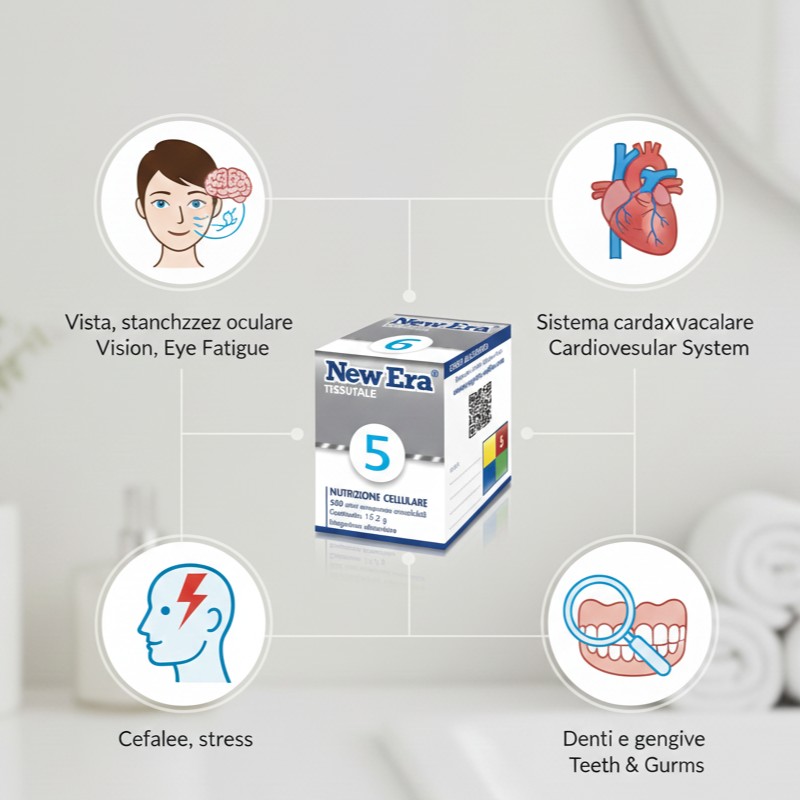 NEW ERA 5 Kalium Muriaticum 240 Compresse Orodispersibili è il Sale di Schussler Cloruro di Potassio coadiuvante in caso di stati di raffreddamento, tosse, raffreddore, respiro affannoso, secrezioni e catarri bianco-grigiastri. Rappresenta il sale della seconda fase dell’infiammazione (subacuta) che di solito si presenta con una secrezione bianco-grigiastra. Ha un’azione prevalentemente sulle mucose e sull’epidermide. Utile in caso di candida, mughetto, placche tonsillari con catarro bianco-grigiatro, dermatite seborroica e forfora.