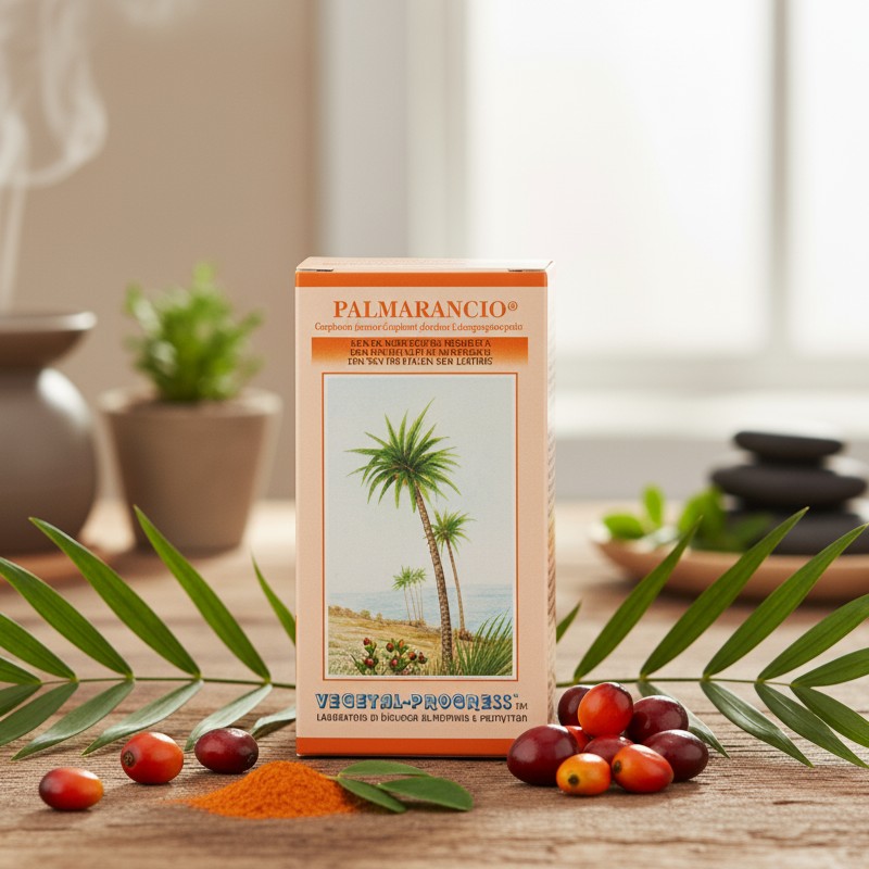 PALMARANCIO® Capsule di Vegetal Progress è un integratore alimentare in capsule molli (softgel), composto da Olio di polpa del frutto di Palma (Elaeis guineensis Jacq.) da agricoltura Biologica al 100%. L’olio, di colore giallo-arancione, è naturalmente ricchissimo di Carotenoidi ($\beta$-carotene, precursore della Vitamina A) e Vitamina E (Tocoferoli e Tocotrienoli), molecole che conferiscono un’importante azione antiossidante e la capacità di favorire un’abbronzatura intensa e duratura.