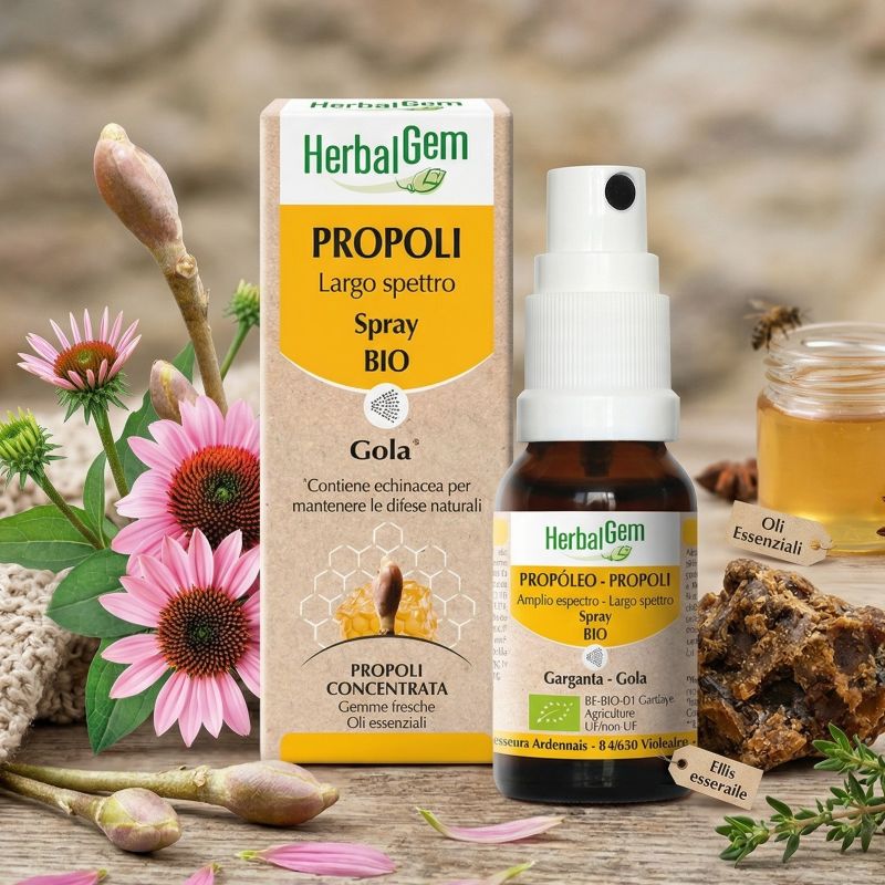 Sostanza resinosa raccolta dalle api dalle gemme per proteggere l’alveare dalle aggressioni esterne, la propoli ha innumerevoli virtù. In inverno, la sinergia di Propoli concentrata HerbalGem sarà l’alleato ideale per adulti e bambini, in caso di mal di gola o di difese immunitarie indebolite.