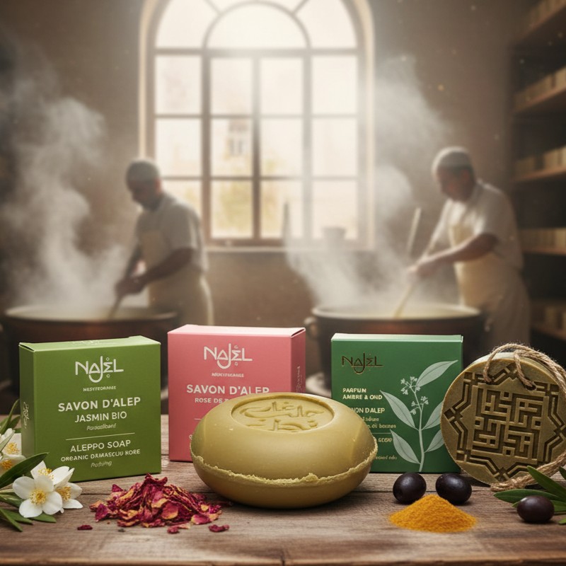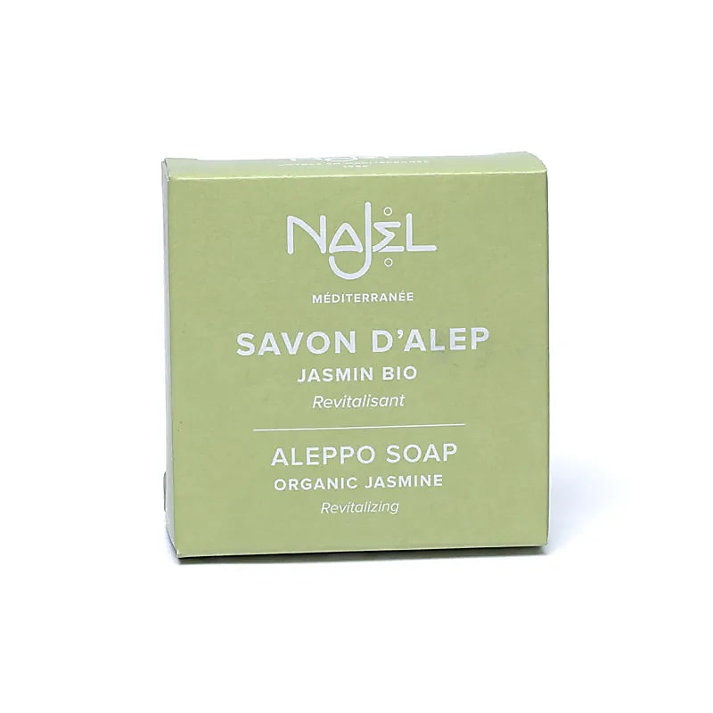 Il sapone di Aleppo Najel al gelsomino biologico combina il know-how ancestrale della produzione del sapone di Aleppo con le virtù dell’acqua di fiori di gelsomino.