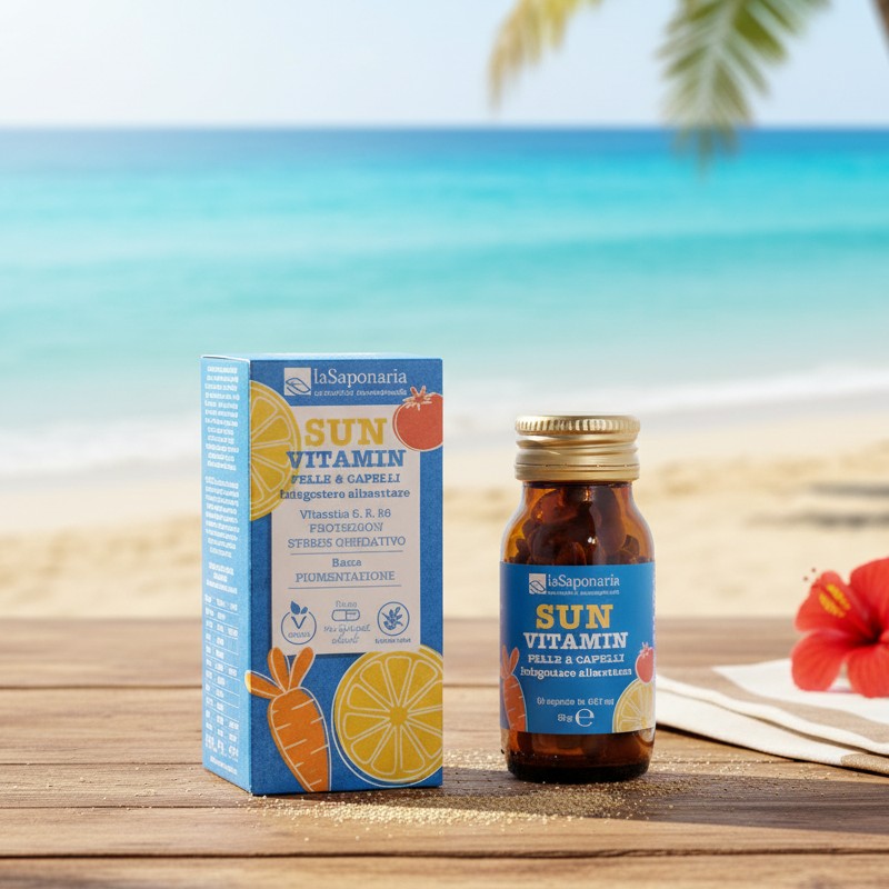 Sun Vitamin è un integratore alimentare con estratti vegetali, vitamine, minerali e cisteina. Contiene un mix di vitamine che contribuiscono a contrastare il danno ossidativo responsabile del foto-invecchiamento e Zinco e Rame che contribuiscono a sostenere pelle e capelli, tessuti più esposti ai raggi solari e agli agenti esterni.