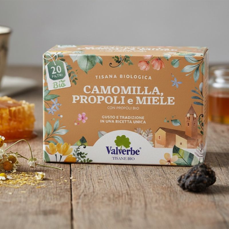 Camomilla propoli e miele, unisce le proprietà del fiore di camomilla con vera propoli all’ 1% e miele. Un gusto unico e intenso che ti regalerà intensi momenti di benessere. Camomilla propoli e miele è ideale alla sera o per alleviare piccoli dolori influenzali, tosse, raffreddore e mal di gola. Adatta sia per gli adulti che per i più piccoli.