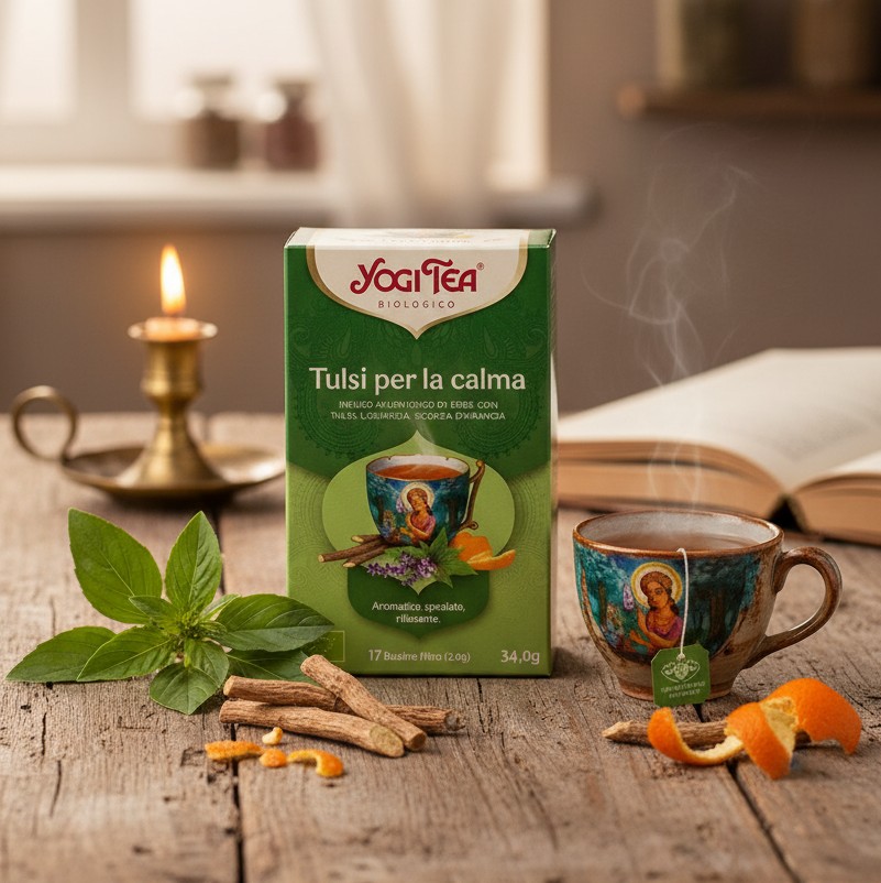 YOGI TEA® TULSI PER LA CALMA (noto anche come Tulsi Relax o Tulsi Serenità) è un infuso ayurvedico di erbe e spezie in bustine filtro, certificato 100% Biologico e senza caffeina. La sua formula è centrata sul Tulsi (Ocimum sanctum), conosciuto nell’Ayurveda come la “Regina delle Erbe” o “Basilico Sacro” per le sue proprietà uniche, ed è pensato per chi cerca serenità e calma interiore nella vita di tutti i giorni.