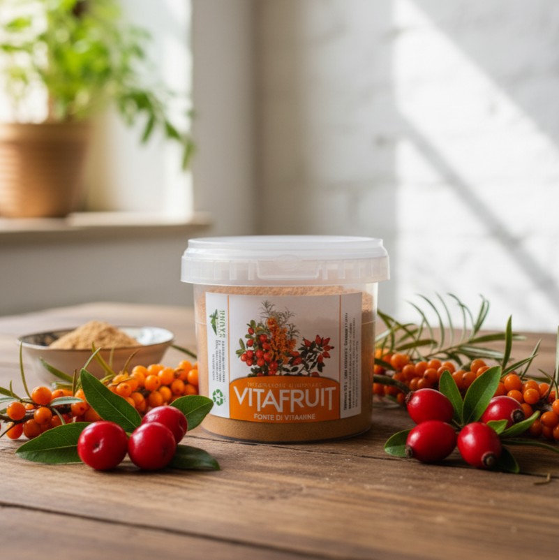 VITAFRUIT è una miscela potente offerta dalla natura per il tuo benessere. Combina i frutti integrali di Acerola, Olivello Spinoso e Rosa Canina, tre delle fonti vegetali più ricche al mondo di Vitamina C naturale, Vitamine del Gruppo B e preziosi antiossidanti. Un vero e proprio scudo per il sistema immunitario e un booster per l’energia quotidiana.